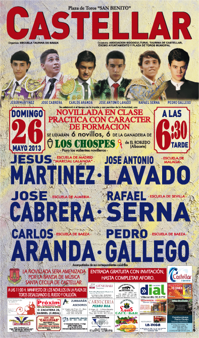 La novillada en este caso fue de una ganadera afincada en la provincia de Albacete, pero con el tributo que su ganadera es nacida y criada en esta misma localidad de Castellar. "Los Chospes", fue el hierro elegido en esta ocasión para este festejo. Seis novillos erales de la línea de Jandilla, adquirida por esta ganadería a Daniel Ruiz Yague, y otro novillo eral más, de la línea, Luis Algarra (Conde de la Corte y Tamarón).